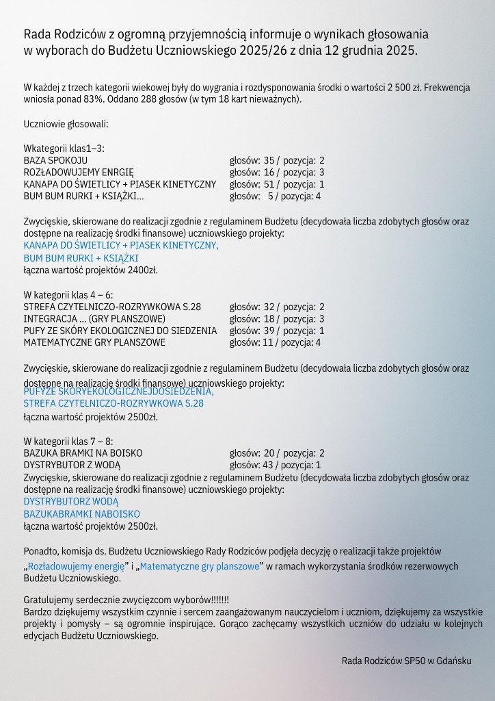 BUDŻET UCZNIOWSKI 2025/2026 - PROJEKTY DO REALIZACJI - Szkoła Podstawowa nr 50 im. Emilii Plater w Gdańsku