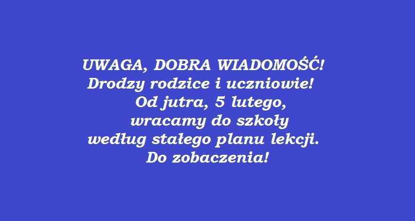 UWAGA DOBRA WIADOMOŚĆ !Drodzy rodzice i uczniowie!Od jutra, 5 lutego, wracamy do szkoły według stałego planu lekcji.Do zobaczenia